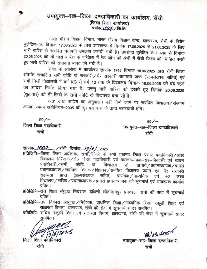 रांची। भारी बारिश को देखते हुए 19 जून को रांची जिला प्रशासन द्वारा स्कूलों को बंद रखने का आदेश आया था और अभी जारी हुए मौजूदा मौसम बुलेटिन में 20 जून को भी भारी बारिश के आसार दिखाई दे रही है,इसी को ध्यान में रखते हुए 20 जून को भी स्कूलों को बंद करने का आदेश आया है।