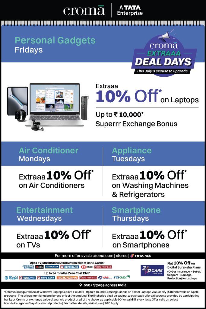 रांची। टाटा समूह के इलेक्ट्रॉनिक्स रिटेल ब्रांड क्रोमा ने जुलाई महीने में ग्राहकों के लिए जबरदस्त ऑफर लेकर ‘एक्स्ट्रा डील डेज़’ की शुरुआत कर दी है। इस खास ऑफर में सोमवार से शुक्रवार तक हर दिन अलग-अलग इलेक्ट्रॉनिक सामानों पर एक्सक्लूसिव डील्स मिल रही हैं।