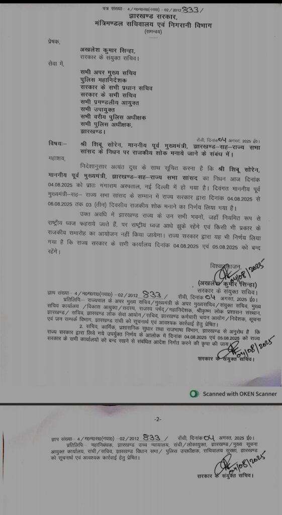 निदेशानुसार अत्यंत दुख के साथ सूचित करना है कि श्री शिबू सोरेन, माननीय पूर्व मुख्यमंत्री, झारखण्ड-सह-राज्य सभा सांसद का निधन दिनांक 04.08.2025 को प्रातः गंगाराम अस्पताल, नई दिल्ली में हो गया है। दिवंगत माननीय पूर्व मुख्यमंत्री-सह- राज्य सभा सांसद के सम्मान में राज्य सरकार द्वारा 04.08.2025 से 06.08.2025 तक 03 (तीन) दिवसीय राजकीय शोक मनाने का निर्णय लिया गया है।