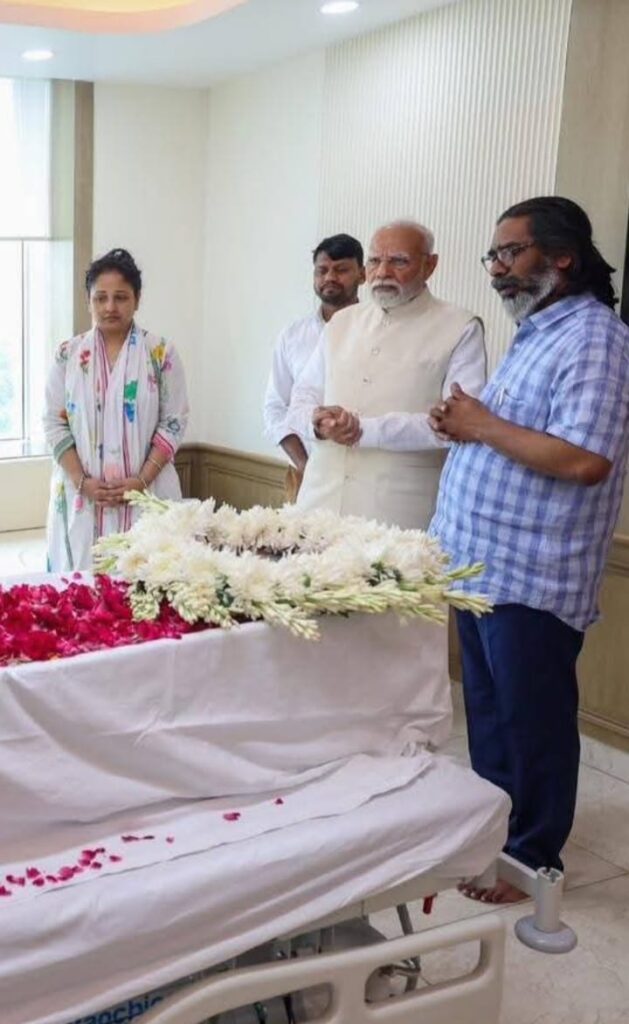 नई दिल्ली । झारखंड आंदोलनकारी झारखंड के तीन बार पूर्व मुख्यमंत्री रहे राज्यसभा सांसद दिशोम गुरु शिबू सोरेन को श्रद्धांजलि देने पहुंचे प्रधानमंत्री नरेंद्र मोदी।