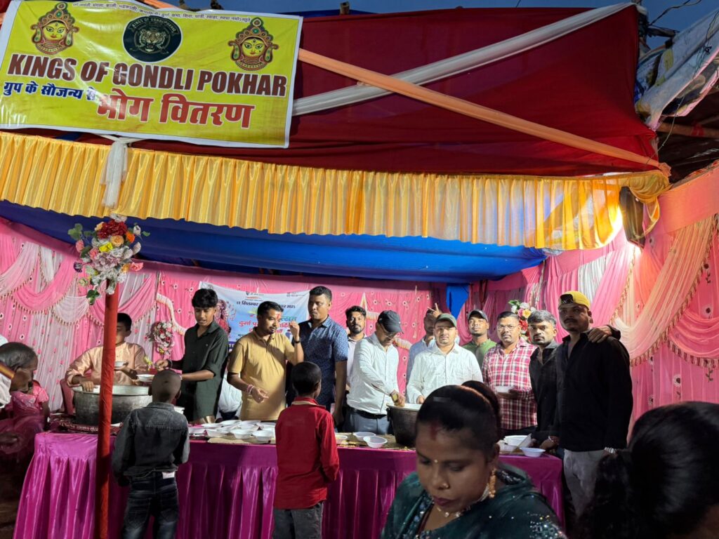 अनगड़ा :- विजयादशमी के पावन अवसर पर गोदलीपोखर दुर्गा पूजा पंडाल में महाभोग वितरण कार्यक्रम का आयोजन किया गया | सामाजिक संगठन किग्स ऑफ गोंदलीपोखर के तत्वथान में श्रद्धालुओं के बीच 201 किलोग्राम खिचड़ी महाभोग का वितरण किया | साथ ही 51 जरूरतमंदों को कंबल भी दिए गए | मौके पर संगठन के सदस्य राजकुमार महतो प्रशांत महतो ने बताया कि आपसी सहयोग से विजयादशमी पर महाभोग वितरण के साथ ही जरूरतमंदों को कंबल दिए गए हैं | संगठन भविष्य में भी सामाजिक दायित्वों का निर्वहन करता रहेगा | मौके पर पंकज महतो दीपक महतो पंकज चौधरी राहुल महतो विवेक चौधरी अजय राज अनुज महतो अनिकेत साहू शंकर महतो संतोष साहू विक्की सोनी धनीराम महतो कमलेश महतो माही कुमार रोहित महतो समेत कई अन्य उपस्थित थे |