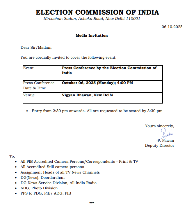 नई दिल्ली । भारत निर्वाचन आयोग (ईसीआई) आज शाम 4 बजे प्रेस कॉन्फ्रेंस कर बिहार विधानसभा चुनाव 2025 के लिए तारीखों और शेड्यूल की आधिकारिक घोषणा करेगा. उम्मीद लगाई जा रही हैं कि बिहार में दो चरणों में मतदान हो सकता है. वहीं, रविवार को पटना में आयोजित प्रेस वार्ता में मुख्य चुनाव आयुक्त ज्ञानेश कुमार ने स्पष्ट कर दिया था कि आगामी विधानसभा चुनाव 22 नवंबर से पहले संपन्न हो जाएगी, क्योंकि 22 नवंबर को वर्तमान कार्यकाल समाप्त हो रहा है. आयोग ने 4 और 5 अक्टूबर को बिहार का दौरा किया, जहां मुख्य निर्वाचन आयुक्त ने राजनीतिक दलों, अधिकारियों, पुलिस और सिविल सोसाइटी से मुलाकात की. इस दौरान कानून-व्यवस्था, व्यय निगरानी और मतदान केंद्रों की व्यवस्था पर चर्चा हुई. राजनीतिक दलों ने चरणों की संख्या पर सुझाव दिए और आयोग ने छठ पूजा (18-28 अक्टूबर) और दिवाली को ध्यान में रखते हुए शेड्यूल तैयार किया है. मतदान संभवतः छठ के बाद अक्टूबर-नवंबर में होगा जो 2020 की तरह कम चरणों में हो सकता है. प्रत्येक बूथ पर केवल 1,200 मतदाताओं की अनुमति होगी. इससे पहले बिहार दौरे के बाद पटना में आयोजित प्रेस कॉन्फ्रेंस में मुख्य चुनाव आयुक्त ज्ञानेश कुमार ने रविवार को कहा कि बिहार में विशेष गहन पुनरीक्षण से 22 साल बाद मतदाता सूची का शुद्धिकरण हुआ है. उन्होंने कहा कि आगामी विधानसभा चुनावों के लिए कई नई पहल की जा रही हैं, जिन्हें आने वाले समय में पूरे देश में दोहराया जाएगा।