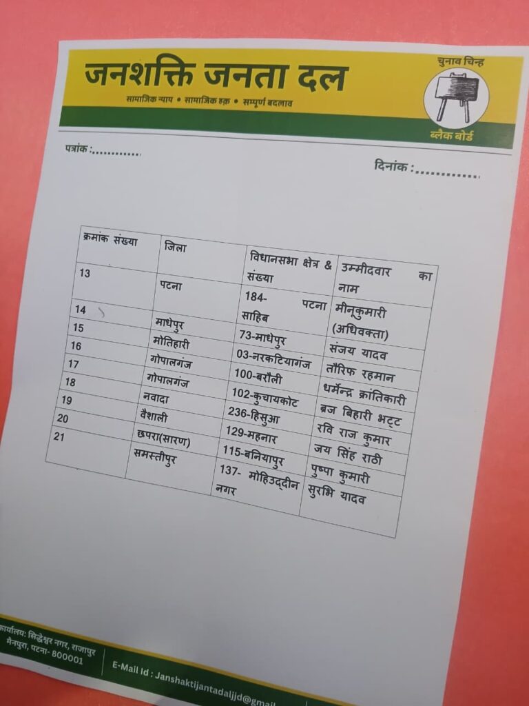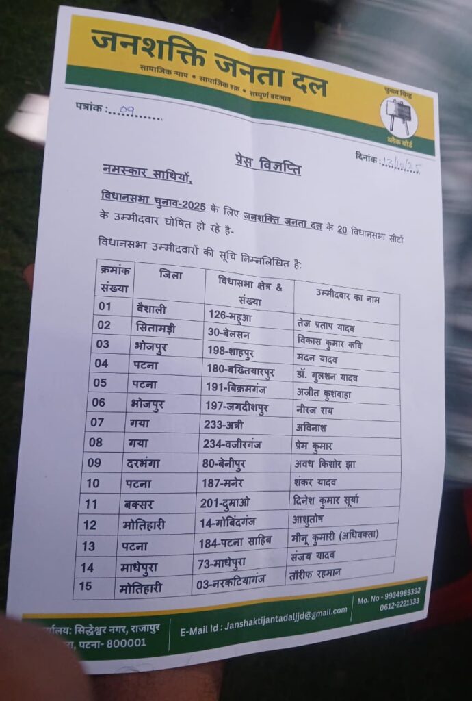 पटना। बिहार में विधानसभा चुनाव की तैयारियों के बीच राजनीति में एक नया मोड़ आ गया है. आरजेडी नेता लालू प्रसाद यादव के बड़े बेटे तेज प्रताप यादव ने अपनी पार्टी जनशक्ति जनता दल की उम्मीदवारों की सूची जारी कर दी है. पार्टी की ओर से जारी इस सूची में तेज प्रताप यादव ने खुद महुआ विधानसभा सीट से चुनाव लड़ने की घोषणा की है. इस फैसले ने राजनीतिक गलियारों में हलचल मचा दी है, क्योंकि महुआ वही सीट है, जहां से तेज प्रताप पहले भी विधायक रह चुके हैं. जनशक्ति जनता दल की ओर से जारी उम्मीदवार सूची में कई नए और युवा चेहरों को मौका दिया गया है. पार्टी ने दावा किया है कि वह जनता से जुड़े मुद्दों को लेकर चुनावी मैदान में उतरेगी।