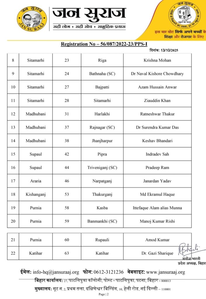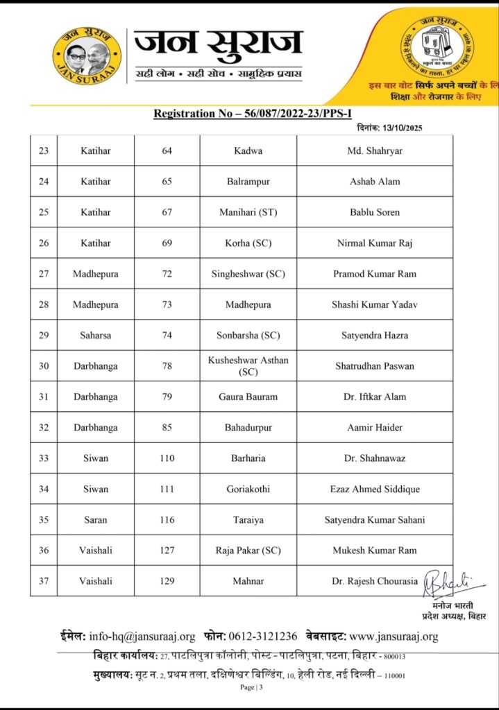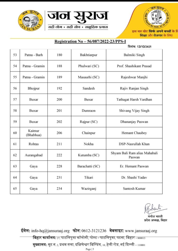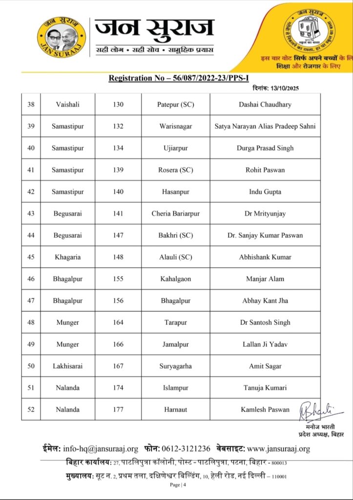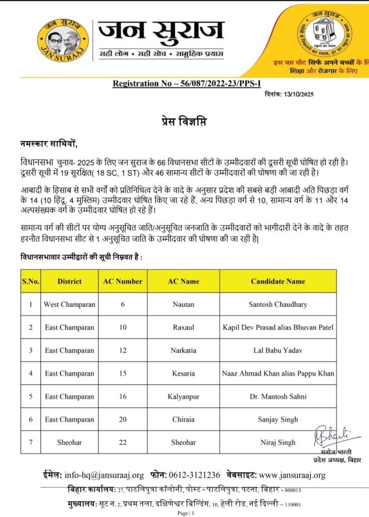 पटना । बिहार विधानसभा चुनाव 2025 के लिए प्रशांत किशोर की पार्टी जन सुराज ने आज उम्मीदवारों की दूसरी लिस्ट जारी कर दी है. इस सूची में कुल 65 उम्मीदवारों के नाम का ऐलान किया गया है, जिसमें मुख्य रूप से 19 सुरक्षित सीटों पर उम्मीदवारों के नाम घोषित किए गए. जन सुराज ने सामाजिक समीकरण साधते हुए अति पिछड़ा वर्ग पर विशेष ध्यान दिया है. इस सूची में 46 अति पिछड़ा उम्मीदवारों में से 14 उम्मीदवार अतिपिछड़ा समुदाय से हैं. इन 14 में से 10 हिंदू और 4 मुस्लिम अतिपिछड़ा समुदाय के उम्मीदवार शामिल हैं. पार्टी ने बड़ा दांव खेलते हुए मुख्यमंत्री नीतीश कुमार के गृह क्षेत्र हरनौत (जो कि एक सामान्य सीट है) से अनुसूचित जाति (SC) के उम्मीदवार कमलेश पासवान को मैदान में उतारा है. कमलेश पासवान हरनौत सामान्य सीट से चुनाव लड़ेंगे।