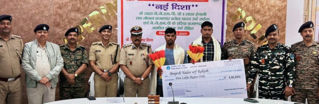 लातेहार : झारखंड के लातेहार में उग्रवादी संगठन जनमुक्ति परिषद के दो उग्रवादियों ने बुधवार को पुलिस के सामने आत्मसमर्पण कर दिया। सरेंडर करने वाले नक्सलियों में ब्रजेश यादव और अवधेश लोहरा शामिल हैं। पुलिस अधीक्षक कार्यालय के सभागार में दोनों उग्रवादियों ने आत्मसमर्पण किया।ब्रजेश यादव गुमला जिले का रहने वाला है। इस पर पांच लाख रूपये का इनाम भी घोषित था, जबकि अवधेश लातेहार के हेरहंज का रहने वाला है। पलामू रेंज के पुलिस महानिरीक्षक शैलेंद्र कुमार सिन्हा और लातेहार के पुलिस अधीक्षक कुमार गौरव ने दोनों उग्रवादियों को माला पहनाकर समाज के मुख्य धारा में स्वागत किया।आईजी शैलेंद्र कुमार सिन्हा ने कहा कि झारखंड सरकार की नई दिशा नीति का लाभ उठाकर नक्सली अपना जीवन सुधार सकते हैं। वर्ष 2025 में अब तक लातेहार जिले में 21 उग्रवादियों ने आत्मसमर्पण किया है, यह किसी भी जिले के लिए बड़ी उपलब्धि है। उन्होंने क्षेत्र में सक्रिय अन्य उग्रवादियों-नक्सलवादियों को भी आत्मसमर्पण करने के लिए प्रेरित किया। लातेहार एसपी कुमार गौरव ने बताया कि लातेहार जिले में नक्सलियों और उग्रवादियों के खिलाफ लगातार कार्रवाई की जा रही है। अब जिले में केवल चार से पांच नक्सली ही बचे हैं। बाकी नक्सलियों के पास मार्च 2026 तक का समय है। मार्च 2026 तक लातेहार जिला पूरी तरह से नक्सल मुक्त हो जाएगा। उन्होंने कहा कि नक्सली या तो आत्मसमर्पण करेंगे या मारे जाएंगे।इस अवसर पर सीमा सुरक्षा बल के कमांडेंट राजेश सिंह, केंद्रीय रिजर्व पुलिस बल के कमांडेंट याद राम बुनकर सहित अन्य अधिकारी उपस्थित थे।