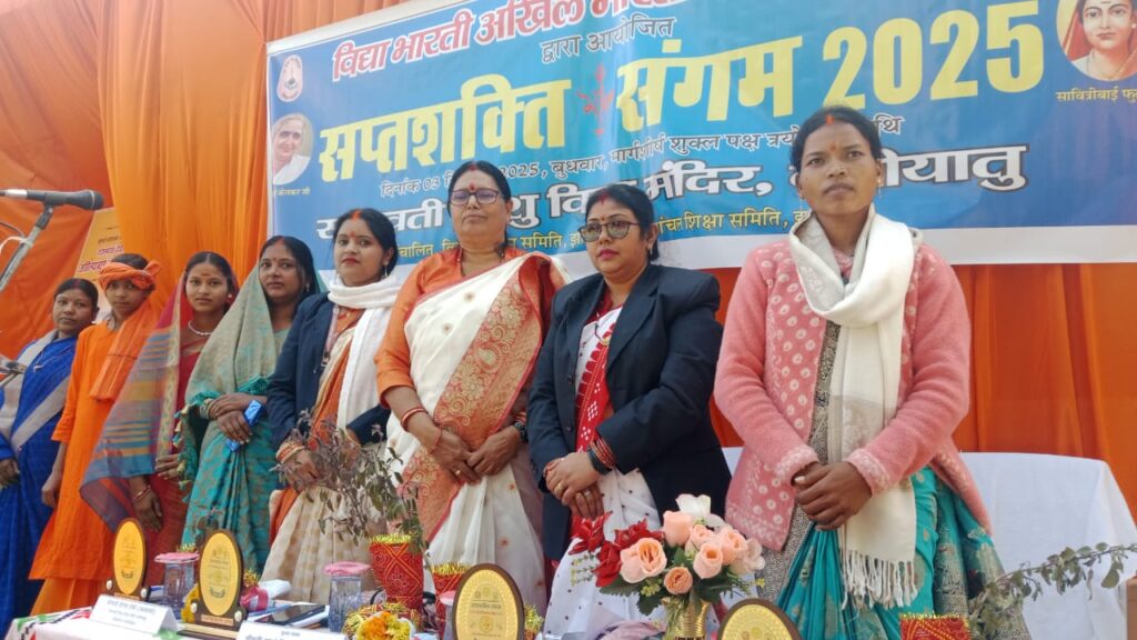 बारियातु : प्रखंड मुख्यालय स्थित सरस्वती शिशु विद्या मंदिर बारियातू में विद्या भारती अखिल भारतीय शिक्षा संस्थान के तत्वाधान में दिनांक 3 दिसंबर 2025 दिन बुधवार को भव्य तरीके से सप्तशक्ति संगम का आयोजन किया गया। कार्यक्रम का शुभारंभ मुख्य वक्ता उषा देवी पूर्व प्रधानाचार्य आश्रम विद्यालय सिसई गुमला गीता देवी आचार्या शिशु विद्या मंदिर लातेहार जिला संयोजिका लातेहार उर्मिला देवी प्रखंड प्रमुख बारीयातू वीणा देवी आचार्या सरस्वती शिशु विद्या मंदिर बारियातू द्वारा मां शारदे ओउम् भारत माता के समक्ष दीप प्रज्वलन एवं पुष्प अर्पित कर किया गया ।कार्यक्रम में कुल 151 महिलाएं 50 पूर्व छात्रा।विद्यालय के दीदी जी ने अपने सहभागिता निभाई। कार्यक्रम के प्रस्तावना प्रस्तुत करते हुए आचार्या वीणा देवी ने कहा कि सप्तशक्ति संगम का मुख्य उद्देश्य महिलाओं के अंदर आत्मविश्वास एवं सशक्तिकरण की भावना जागृत करना है। राष्ट्रीय स्वयंसेवक संघ के 100 वर्ष पूर्ण होने पर महिलाओं के अंदर सप्तशक्ति को जागृत करने के लिए सप्तशक्ति संगम का आयोजन किया गया है ।कीर्ति, श्री, वाक्, स्मृति, मेधा, धृति, क्षमा यें सात शक्ति महिलाओं के अंदर विद्यमान है। ऐसा भगवान श्री कृष्ण ने गीता उपदेश में बताया है। यह सात शक्ति भागवत गीता के दसवें अध्याय के 34 में श्लोक में वर्णित है। मुख्य वक्ता पूर्व प्रधानाचार्य उषा देवी जी ने सप्तशक्ति संगम में अपने विषय को रखते हुए कहा कि पश्चिमी सभ्यता देश में आने के कारण घर से संयुक्त परिवार में बिखराव हो रहा है। तुलसी पौधा से संयुक्त परिवार की एकता का विकास होता है। घरों की पहचान हमारी परंपरा से होती है इसलिए हमारा घर भारतीय सभ्यता के अनुसार हो ।हमारी भाषा भारतीय हो। भाषा मां की दर्पण होती है। भारत में रहते हुए अपनी भाषा का प्रयोग भारतीय संस्कृति के अनुरूप होना चाहिए। मातृभाषा में संस्कार सभ्यता की झलक दिखती है ।हमारे घरों में वेशभूषा आभूषण व्यंजन मनोरंजन भारतीय हो। परिवारों को सुरक्षित रखने से राष्ट्र का निर्माण होता है। गीता देवी जी ने अपना विषय रखते हुए कहा कि अपने बच्चों को समान रूप से संस्कार देने की आवश्यकता है। सभी युगों में महिलाओं का त्याग सर्वोत्तम है ।जन्मदिन विवाह आदि के समारोह का आयोजन भारतीय परंपरा के अनुसार हो। समाज में लोकगीतों का बढ़ावा हो ।शादी विवाह कार्यक्रम में भोजन बैठ कर करने से भोजन की बर्बादी को रोका जा सकता है। दहेज प्रथा को समाप्त कर आदर्श समाज का निर्माण करना चाहिए। अध्यक्षीय उद्बोधन में प्रखंड प्रमुख श्रीमती उर्मिला देवी ने कहा कि इस कार्यक्रम से हम सभी को सीख लेनी चाहिए। सप्तशक्ती संगम में जितने भी बातें बताई गई इससे समाज में परिवर्तन हो सकता है