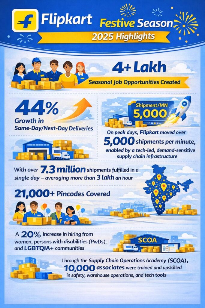 रांची: भारत के ई-मार्केटप्लेस फ्लिपकार्ट ने 2025 के त्योहारी सीजन में अपने सप्लाई चेन नेटवर्क के जरिए अभूतपूर्व प्रदर्शन किया। बिग बिलियन डेज (बीबीडी) 2025 के दौरान यूनिट्स में 24 प्रतिशत वृद्धि, व्यस्ततम दिनों में हर मिनट 5,000 से अधिक शिपमेंट और एक दिन में 73 लाख से ज्यादा शिपमेंट रिकॉर्ड किए गए। इस बार टियर 2 और टियर 3 शहरों से कुल ऑर्डर का 60 प्रतिशत से अधिक हिस्सा आया। झज्जर और बहराइच जैसे शहरों में ऑर्डर में 80 प्रतिशत तक की वृद्धि, जबकि छोटे फर्नीचर और घरेलू सामान की श्रेणियों में नॉन-मेट्रो बाजारों में 90 प्रतिशत तेजी देखी गई। बढ़ती मांग को पूरा करने के लिए 28 राज्यों में 4 लाख से अधिक सीजनल रोजगार सृजित किए गए, जिनमें 15 प्रतिशत लोग पहली बार इस क्षेत्र में शामिल हुए। सप्लाई चेन ऑपरेशंस अकादमी (एससीओए) के माध्यम से 10,000 से अधिक कर्मचारियों को प्रशिक्षित किया गया और 6,000 से ज्यादा कॉलेज छात्रों को हाइब्रिड लर्निंग के जरिए सप्लाई चेन मैनेजमेंट में ट्रेनिंग मिली। सेम-डे और नेक्स्ट-डे डिलीवरी में 44 प्रतिशत की वृद्धि हुई। एआई और मशीन लर्निंग आधारित फोरकास्टिंग, ऑटोमेटेड इन्वेंटरी, रोबोटिक्स और सेंसर-आधारित ट्रैकिंग से नेटवर्क ने तेज और सटीक डिलीवरी सुनिश्चित की। समावेशी रोजगार पर जोर देते हुए महिलाओं, दिव्यांगजनों और एलजीबीटीक्यूआईए+ समुदाय की नियुक्तियों में 20 प्रतिशत वृद्धि हुई। फ्लिपकार्ट ग्रुप के सीनियर वाइस प्रेसिडेंट हेमंत बद्री ने कहा, ‘यह त्योहारी सीजन सिर्फ तेजी और विस्तार का नहीं, बल्कि भरोसा, समावेश और सामाजिक प्रभाव का प्रतीक रहा। टेक्नोलॉजी और लोगों के समन्वय से फ्लिपकार्ट ने पूरे भारत में त्योहारी खुशियों को नई ऊंचाई दी।’