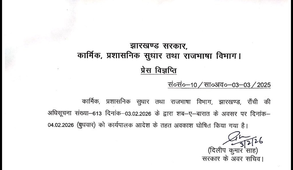रांची । झारखंड सरकार ने शब ए बारात के मौके पर सार्वजनिक अवकाश का एलान किया है । इस सबंध में अधिसूचना जारी कर दी गई है । 4 फरवरी को शब-ए-बारात है।इस दिन मुस्लिम धर्म मानने वालों के लिए बड़ा महत्व है । मुख्यमंत्री हेमंत सोरेन ने शब-ए-बारात की शुभकामनाएं दी है । शब-ए-बारात को मुस्लिम समुदाय में विशेष धार्मिक महत्व प्राप्त है। इस दिन मुस्लिम श्रद्धालु रात भर इबादत करते हैं और अल्लाह से मगफिरत व रहमत की दुआ मांगते हैं। इसे ‘माफी की रात’ भी कहा जाता है।
