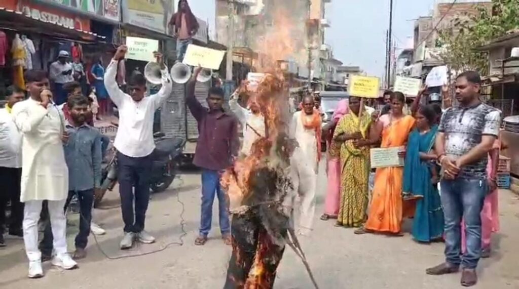 प्रतापपुर, चतरा । प्रतापपुर प्रखंड में मनरेगा,पेंशन व वित्त में घुसखोरी को लेकर सोमवार को प्रखंड विकास पदाधिकारी अभिषेक पांडेय के विरोध मार्च निकालकर पुतला दहन किया गया।इस विरोध मार्च व पुतला दहन पूर्व कॉग्रेस युवा जिला अध्यक्ष मोतीलाल पासवान के नेतृत्व में किया गया।इस दौरान मोतीलाल पासवान ने अपने सैकड़ो समर्थको के साथ प्रखंड कार्यालय मार्ग होते हुए मुख्य चौक तक निकाला।इस दौरान उन्होने ने प्रतापपुर बीडीओ घुसखोर है,मनरेगा,वित्त व पेंशन में घुस लेना बंद करो,प्रतापपुर बीडीओ व अन्य कर्मी होश में आओ,मजदुरो के साथ अन्याय बंद करो,बीडीओ मुर्दाबाद समेत अन्य कई विरोधी नारे लगाया।इसके उपरांत मुख्य चौक पर बीडीओ अभिषेक पांडेय का पुतला दहन किया गया।इस संबंध में विरोध मार्च का नेतृत्व मोतीलाल पासवान ने बताया की प्रतापपुर प्रखंड विकास पदाधिकारी,प्रखंड कार्यक्रम पदाधिकारी व ब्लॉक के अन्य कर्मीयो के द्वारा मनरेगा मजदुरो,आवास लाभुक व पेंशनधारियो का दोहन किया जा रहा है मनरेगा योजना व पेंशन करने में बीडीओ के द्वारा पैसा उगाही किया जा रहा है मनरेगा में प्रत्येक डिमांड पर 2 हजार एवं पेंशन में एक हजार रूपये की उगाही किया जा रहा है पैसा नही देने वाले को सरकारी योजना से वंचित किया जाता है मनरेगा में पैसा उगाही करने के बाद भी मनरेगा मजदुरो को भुगतान नही किया जाता है इसके अलावे आवास में भी वसूली किया जाता है ब्लॉक में बढ़ते कमिशन व घुसखोरी को लेकर जिला को सूचना दिये है लेकिन जिला के द्वारा बीडीओ पर कोई कारवाई नही किया गया है थकहार हारकर हमलोग बीडीओ के कमिशनखोरी के विरूद्ध विरोध मार्च निकालकर बीडीओ का पुतल दहन किया गया है अगर ब्लॉक में घुसखोरी पर लगाम नही लगा तो हम जिला में वृह्द पैमाने पर विरोध व पुतला दहन किया जाएगा।मालूम हो की प्रतापपुर प्रखंड के सभी पंचायतो में मनरेगा योजना में हमेशा अनिमियिता को लेकर शिकायत किया गया है वही बीडीओ अभिषेक पान्डेय अपने कार्यशैली को लेकर पिछले कई माह से चर्चा में है सरकारी कार्य दिवस के दिन भी प्रखंड कार्यालय में नही उपस्थित होते है।