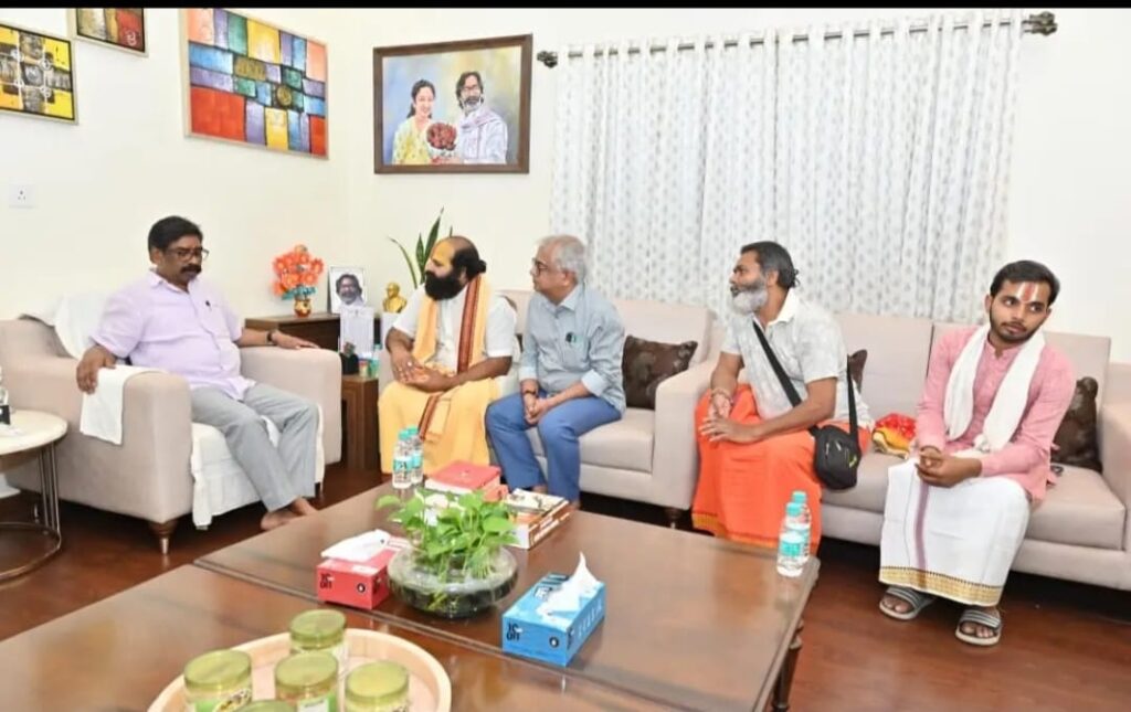 अनगड़ा/रांची: हेमन्त सोरेन से आज कांके रोड स्थित मुख्यमंत्री आवासीय कार्यालय में तपोवन मंदिर, निवारनपुर के महंत ओम प्रकाश शरण के नेतृत्व में एक प्रतिनिधिमंडल ने शिष्टाचार मुलाकात की।