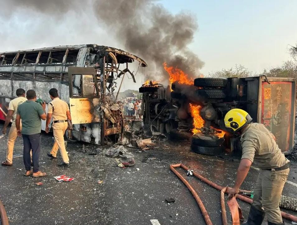 विजयवाड़ा । आंध्र प्रदेश के मार्कापुरम जिले में गुरुवार की सुबह एक दिल दहला देने वाला सड़क हादसा हो गया. रायवरम के पास हरिकृष्णा ट्रेवल्स की एक प्राइवेट बस ने टिपर ट्रक से टक्कर मार दी. टक्कर इतनी जोरदार थी कि बस में तुरंत आग लग गई और बस पूरी तरह जलकर राख हो गई. इस दुर्घटना में 13 लोगों की मौत हो गई, जिनमें कई यात्री जिंदा जल गए. मुख्यमंत्री चंद्रबाबू नायडू ने इस घटना पर गहरा जताते हुए अधिकारियों से घायलों के इलाज की जानकारी ली. उन्होंने हादसे के कारणों की व्यापक जांच के आदेश दिए हैं. पुलिस ने बताया कि मार्कापुरम जिले के रायवरम के पास खदानों के समीप बुधवार की देर रात एक निजी बस और टिपर ट्रक में भीषण टक्कर की सूचना मिली थी. टक्कर इतनी जोरदार थी कि बस में आग लग गई. हादसे में बस के अंदर फंसे 13 यात्रियों की जिंदा जलने से मौत हो गई है, जबकि 20 अन्य लोग गंभीर रूप से घायल हुए हैं. स्थानीय लोगों की मदद से घायलों को तुरंत पास के विभिन्न अस्पतालों में भर्ती कराया है, जहां उनका इलाज जारी है. पुलिस के अनुसार, बस तेलंगाना के निर्मल से आंध्र प्रदेश नेल्लोर की ओर जा रही थी. चश्मदीदों के मुताबिक टक्कर इतनी जोरदार थी कि यात्रियों को बाहर निकलने का मौका ही नहीं मिला. देखते ही देखते पूरी बस जलकर राख हो गई।