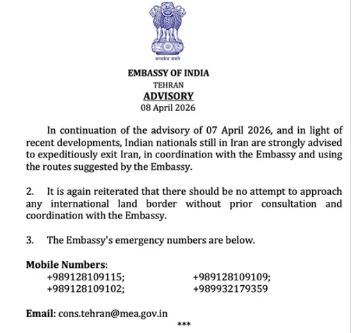 नई दिल्ली । ईरान में बढ़ते संघर्ष के बीच भारतीय दूतावास, तेहरान ने बुधवार को नई सुरक्षा एडवाइजरी जारी की. इसमें ईरान में रह रहे भारतीय नागरिकों को जल्दी से जल्दी देश छोड़ने की सलाह दी गई है. इसके साथ ही दूतावास ने आपातकालीन और समन्वय के लिए हेल्पलाइन नंबर भी जारी किए हैं. दूतावास की एडवाइजरी में कहा गया है, “07 अप्रैल 2026 की एडवाइजरी के संदर्भ में और हाल की घटनाओं को देखते हुए, ईरान में रह रहे भारतीय नागरिकों को दूतावास के मार्गदर्शन और सुझाए गए मार्गों का पालन करते हुए जल्द से जल्द ईरान छोड़ने की सख्त सलाह दी जाती है. इसके अलावा एडवाइजरी में यह भी स्पष्ट किया गया कि किसी भी अंतरराष्ट्रीय सीमा के पास बिना दूतावास से पूर्व परामर्श किए जाने का कोई प्रयास नहीं किया जाना चाहिए. इससे एक दिन पहले भारतीय दूतावास ने नागरिकों को पहले भी एक एडवाइजरी जारी की थी. इसमें कहा गया था कि “ईरान में मौजूद भारतीय नागरिक अगले 48 घंटों तक अपने ठिकानों पर ही रहें. इस दौरान वे बिजली के उपकरणों, सैन्य प्रतिष्ठानों और बहुमंजिला इमारतों की ऊपरी मंजिलों से दूर रहें. घर के अंदर ही रहें और राजमार्ग पर किसी भी तरह की यात्रा केवल दूतावास के सख्त निर्देश और समन्वय से ही करें अमेरिका के राष्ट्रपति डोनाल्ड ट्रंप ने खुद की निर्धारित की हुई समय-सीमा खत्म होने से करीब 90 मिनट पहले घोषणा की कि अमेरिका ने पाकिस्तान के प्रस्ताव पर ईरान के साथ दो सप्ताह के संघर्षविराम पर सहमति जताई है. ट्रंप ने मंगलवार शाम (अमेरिकी समयानुसार) ट्रुथ सोशल पर यह घोषणा की. दूसरी ओर डेमोक्रेटिक पार्टी के नेता ईरानी सभ्यता को खत्म करने की ट्रंप की धमकी को लेकर उन्हें पद से हटाने की मांग कर रहे हैं. ट्रंप ने सोशल मीडिया पोस्ट में कहा, ‘‘पाकिस्तान के प्रधानमंत्री शहबाज शरीफ और फील्ड मार्शल आसिम मुनीर ने बातचीत कर अनुरोध किया कि मैं आज रात ईरान के खिलाफ होने वाली विनाशकारी कार्रवाई को रोक दूं लेकिन इस शर्त पर कि इस्लामिक रिपब्लिक ऑफ ईरान होर्मुज जलडमरूमध्य को पूरी तरह, तुरंत और सुरक्षित तरीके से खोलने पर सहमत हो.’’